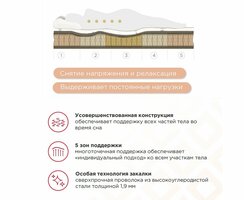 • Мультизональный блок независимых пружин Comfort 5Zone (800 штук на спальное место) имеет 5 зон жесткости и оказывает многоточечную поддержку. Пружины изготовлены из сверхпрочной проволоки из высокоуглеродистой стали толщиной 1,9 мм. Боковины пружинного блока усилены ППУ, что увеличивает прочность матраса.