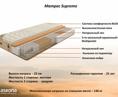 Supremo – это новый продукт, не имеющий аналогов на рынке! Материалы и наполнители, содержат экологически чистое бамбуковое волокно, которое позволяет устранить избыточную влагу и тепло и обеспечивают свободную циркуляцию воздуха. Уникальное покрытие матраса создает отличную терморегуляцию и свежесть. Оно отличается от всех прочих покрытий легкостью, мягкостью, оно не мнется, не электризуется, обладает высокими показателями износостойкости.