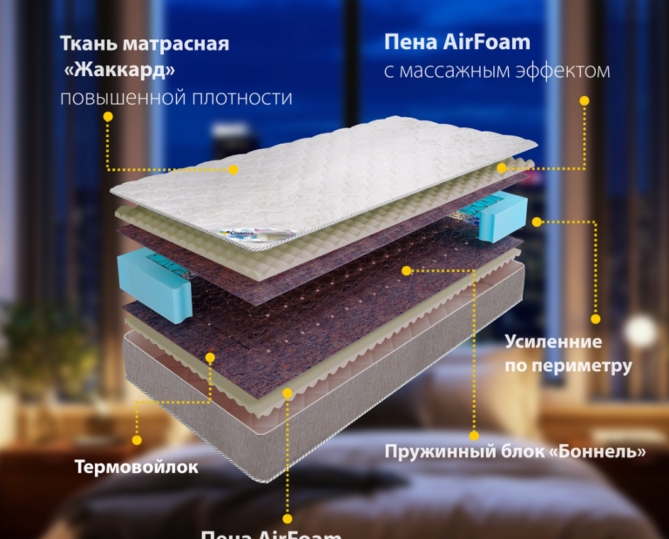 Чехол: Ткань матрасная "Жаккард" повышенной плотности (100% полиэстер), стеганая синтепоном
