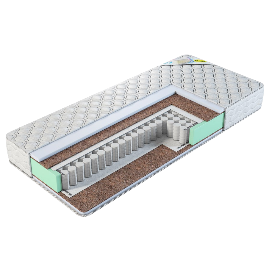 Матрас упругий, средней жесткости. Мягкий слой матраса состоит из современного качественного наполнителя — холлофайбера и слоя кокосовой койры. Эти материалы хорошо вентилируются, не впитывают пыль и влагу. Холлофайбер придает матрасу упругость, а кокос жесткость. Наличие данных наполнителей позволяет данной модели матраса выдерживать нагрузку до 120 кг.