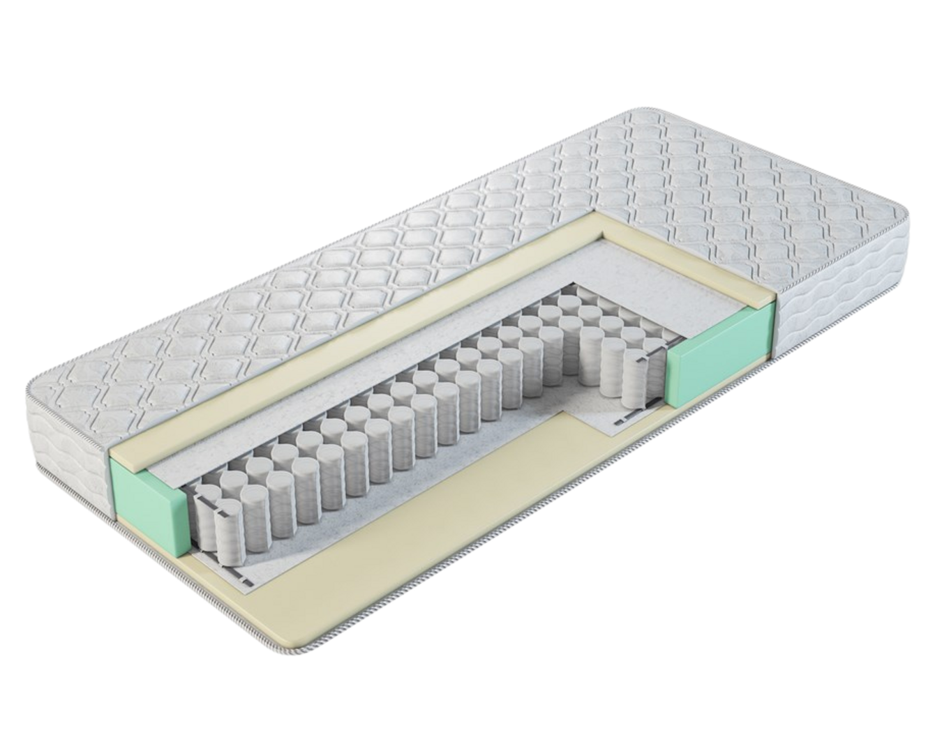 Матрас «Солвейг» исполнен из блока независымых пружин (не менее 250 пружин на м2) и материалов, обеспечивающих среднюю жесткость.